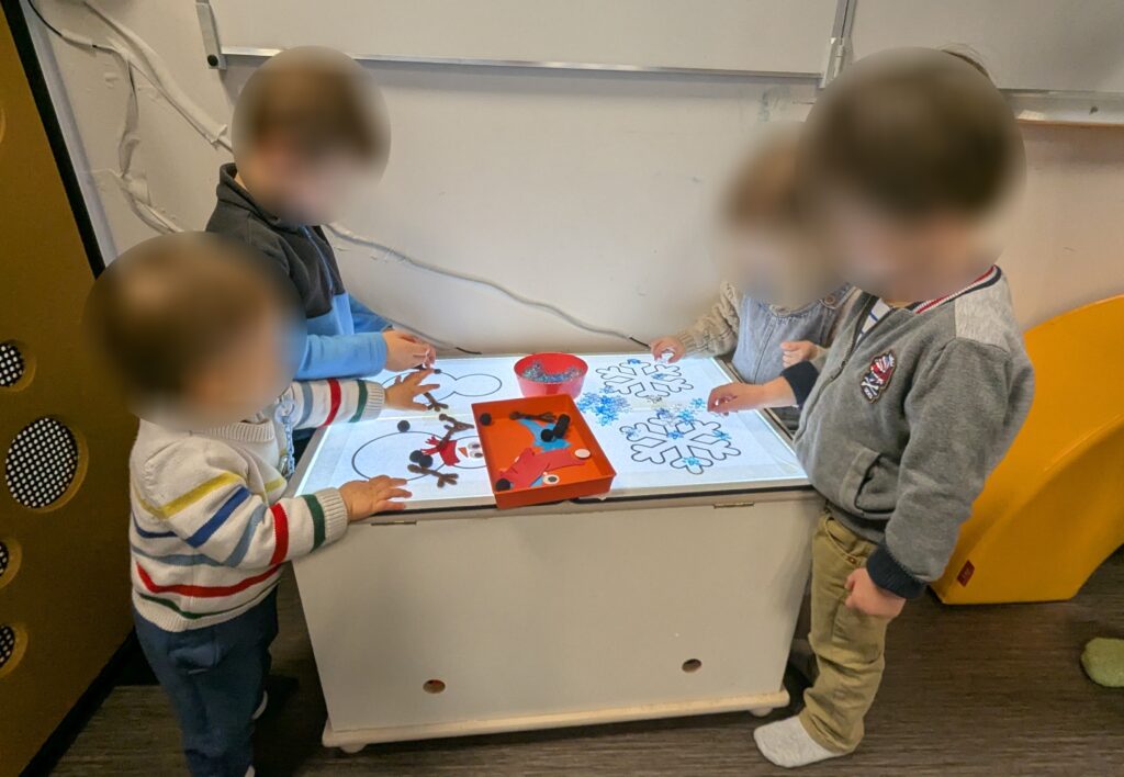 La tablette lumineuse a captivé l’attention des enfants. Une silhouette de bonhomme de neige à reconstituer, des flocons à déplacer librement… Chacun a pu laisser parler son imagination. Ce support stimule la concentration, la perception visuelle et encourage la créativité à travers le jeu libre.