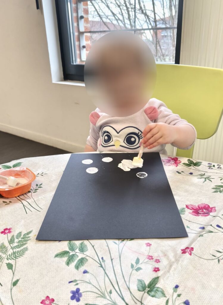 Un autre atelier invitait les enfants à faire tomber la neige. À l’aide de peinture blanche, ils ont réalisé de petits points sur une feuille noire pour créer des flocons et parfois des tempêtes. Bien emmitouflés avec manteau et bonnet, ils ont pris la pose. Leur photo, découpée et collée sur la feuille, les a plongés au cœur de leur propre paysage hivernal. Cette activité favorise la motricité fine, la coordination œil-main et renforce l’estime de soi en se voyant acteur de sa création.