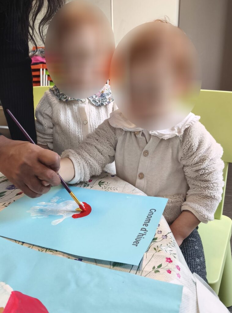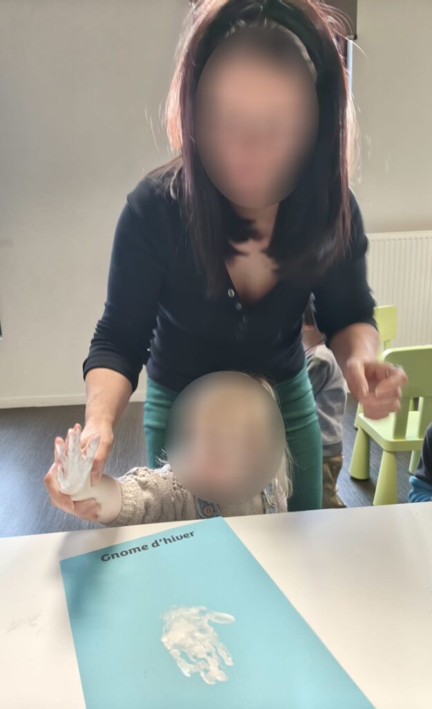Place à la création artistique avec l’empreinte de main transformée en gnome. La peinture blanche appliquée directement sur la main a suscité parfois des sourires, parfois des petites surprises… Une expérience sensorielle qui stimule le toucher, développe la conscience du corps et encourage l’expression créative, tout en laissant une trace unique de l’instant.