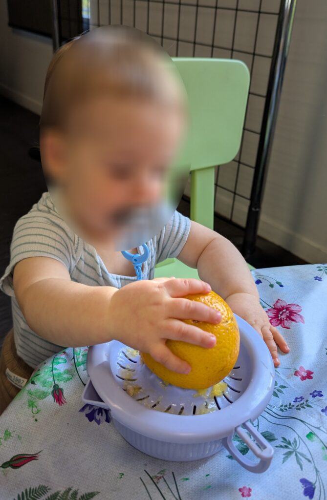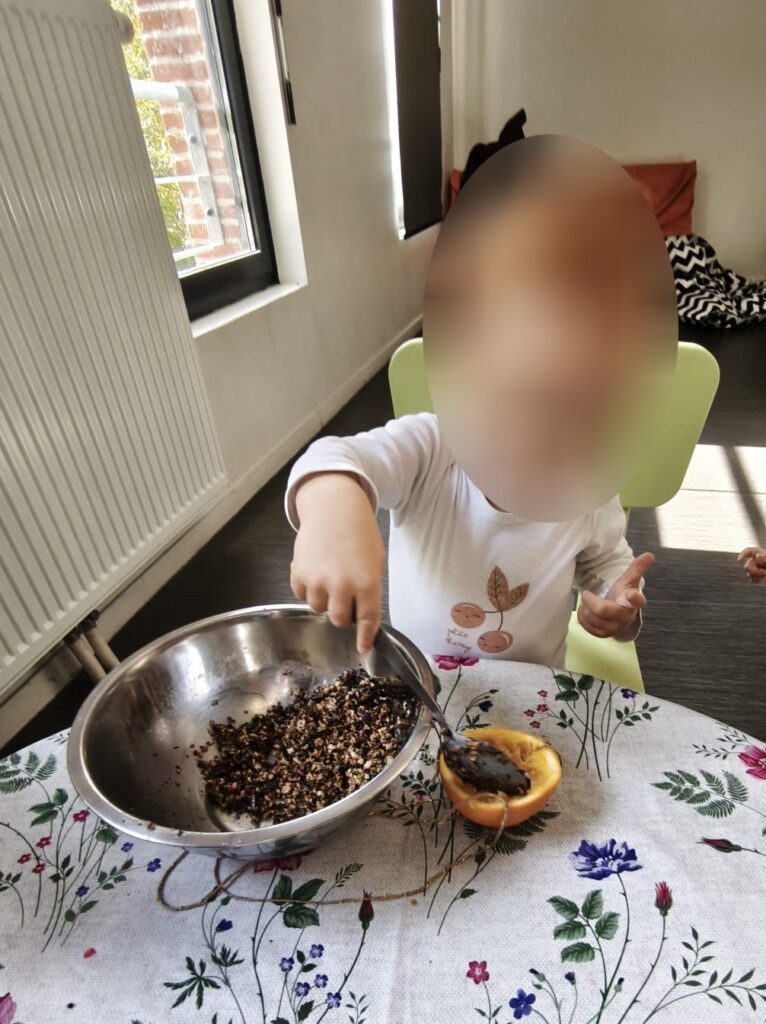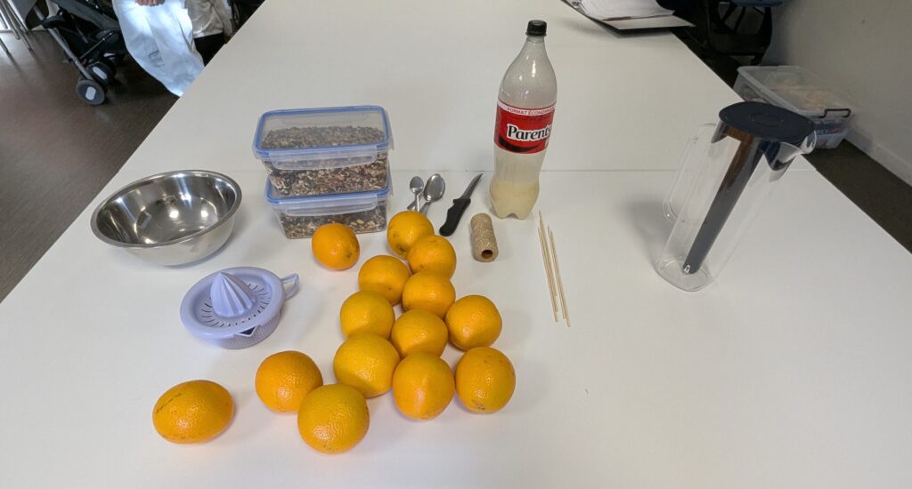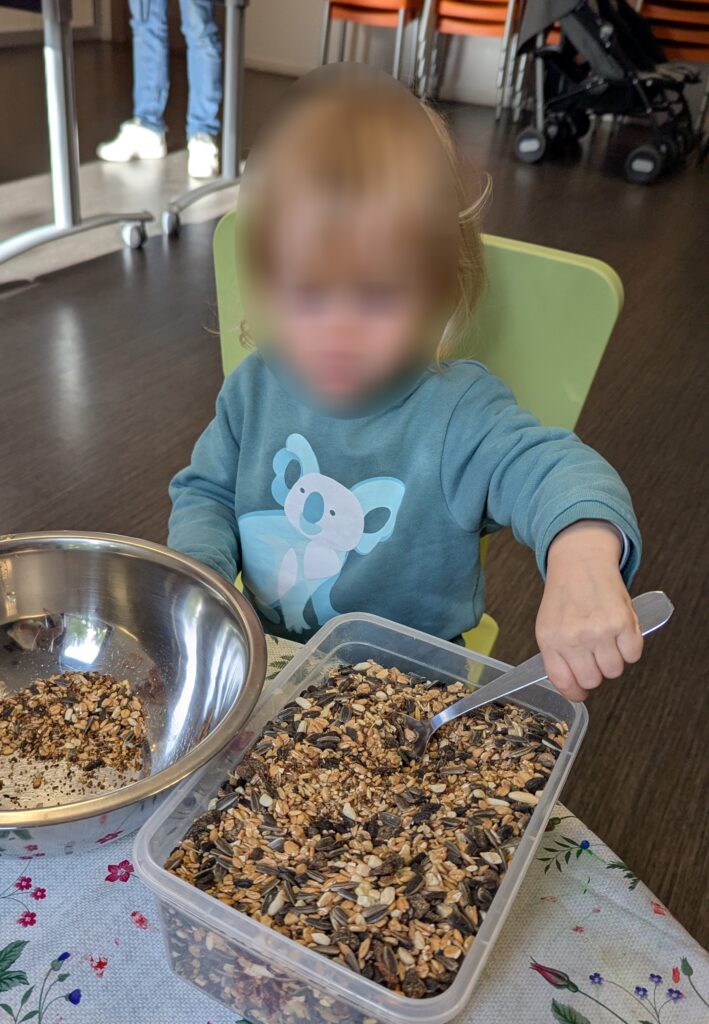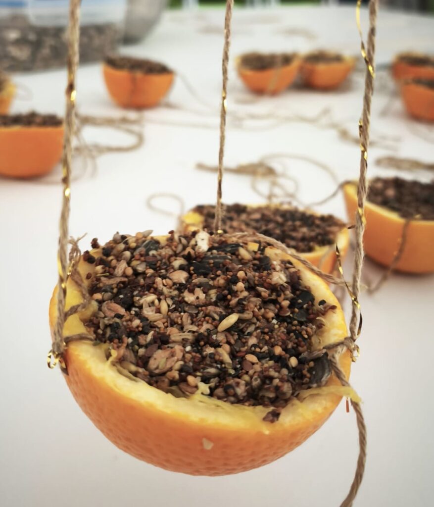 Après avoir pressé des oranges, dont ils ont gardé le jus pour le déguster plus tard, ils ont mélangé des graines pour oiseaux sauvages avec de la végétaline, et ils ont rempli les demi-oranges de ce mélange gourmand. Cette activité riche en découvertes sensorielles a permis aux enfants de manipuler, sentir, observer et comprendre la nature, tout en les sensibilisant à la bienveillance envers les animaux et au respect de l’environnement.