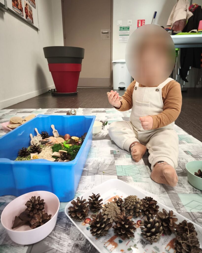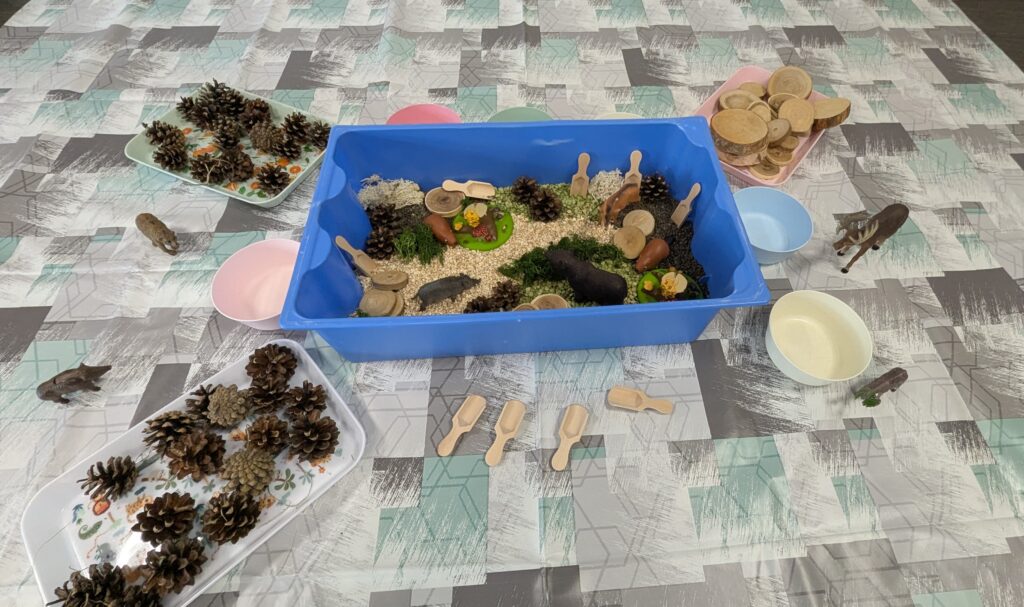 Après cette belle rencontre avec Picou, les enfants ont exploré notre nouveau bac sensoriel sur le thème de la forêt. Celui-ci était composé d’un sol naturel fait de flocons d’avoine, de lentilles et de pois cassés, sur lequel reposaient des rondins de bois, de la mousse végétale, des pommes de pin et de petits animaux de la forêt.