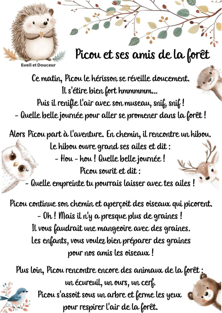 Ce petit moment de partage gourmand a laissé place à un temps calme et apaisant, rythmé par la lecture d’histoires et le chant de la comptine “Promenons-nous dans les bois”. Une belle façon de terminer la séance tout en douceur, dans une atmosphère sereine et pleine de complicité. Les enfants sont repartis heureux, et impatients de retrouver Picou le hérisson pour de nouvelles découvertes lors de la prochaine séance.