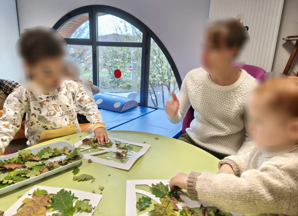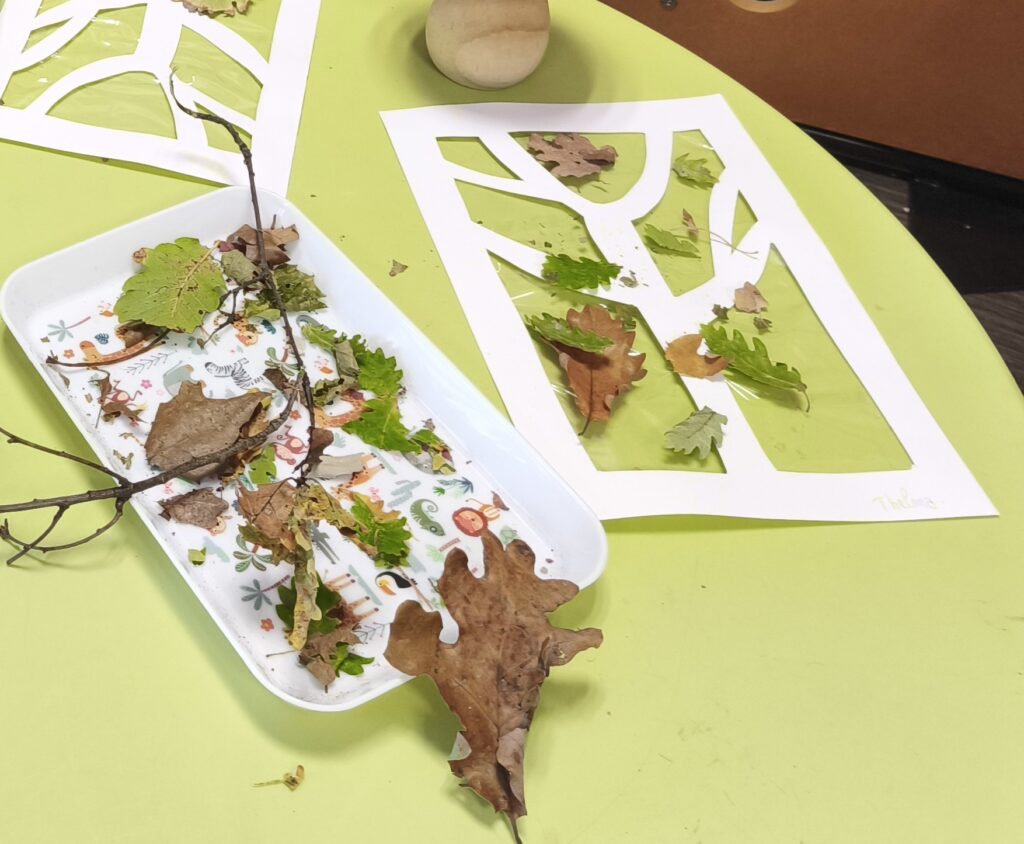 Ils ont ensuite décoré les branches d’un arbre nu avec les feuilles séchées qu’ils avaient récoltées lors de notre sortie dans le bois. Coller, positionner, choisir les plus belles feuilles… Une activité qui leur permet d’exprimer leur créativité tout en consolidant leur motricité fine et leur précision.