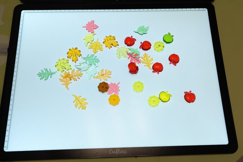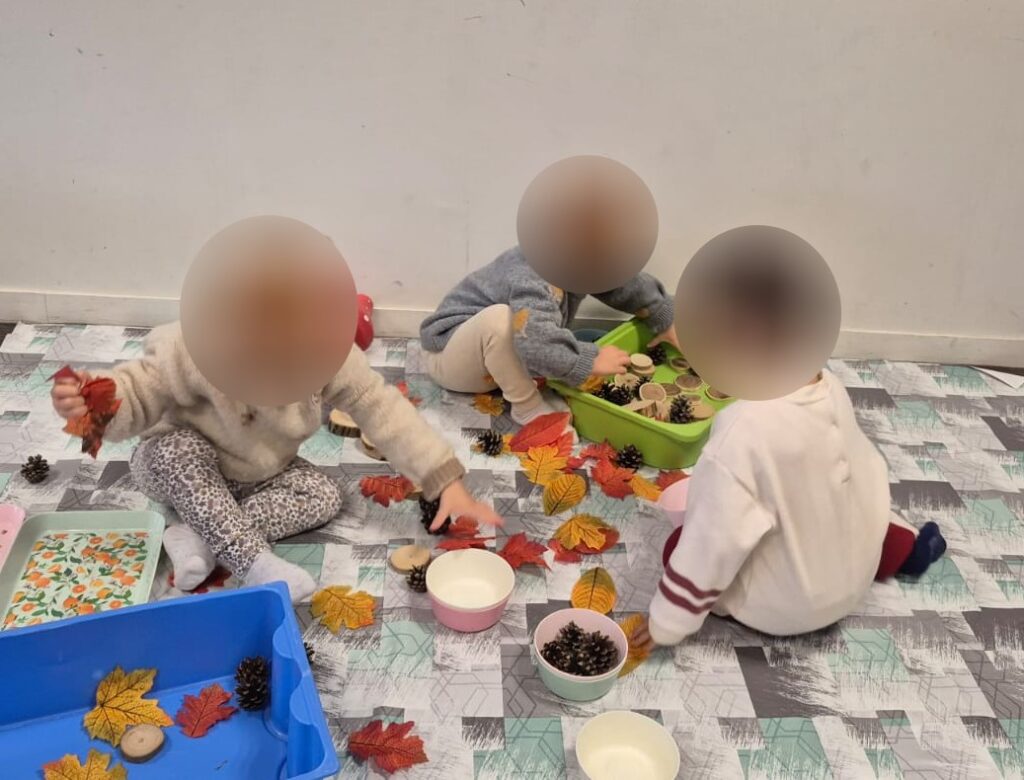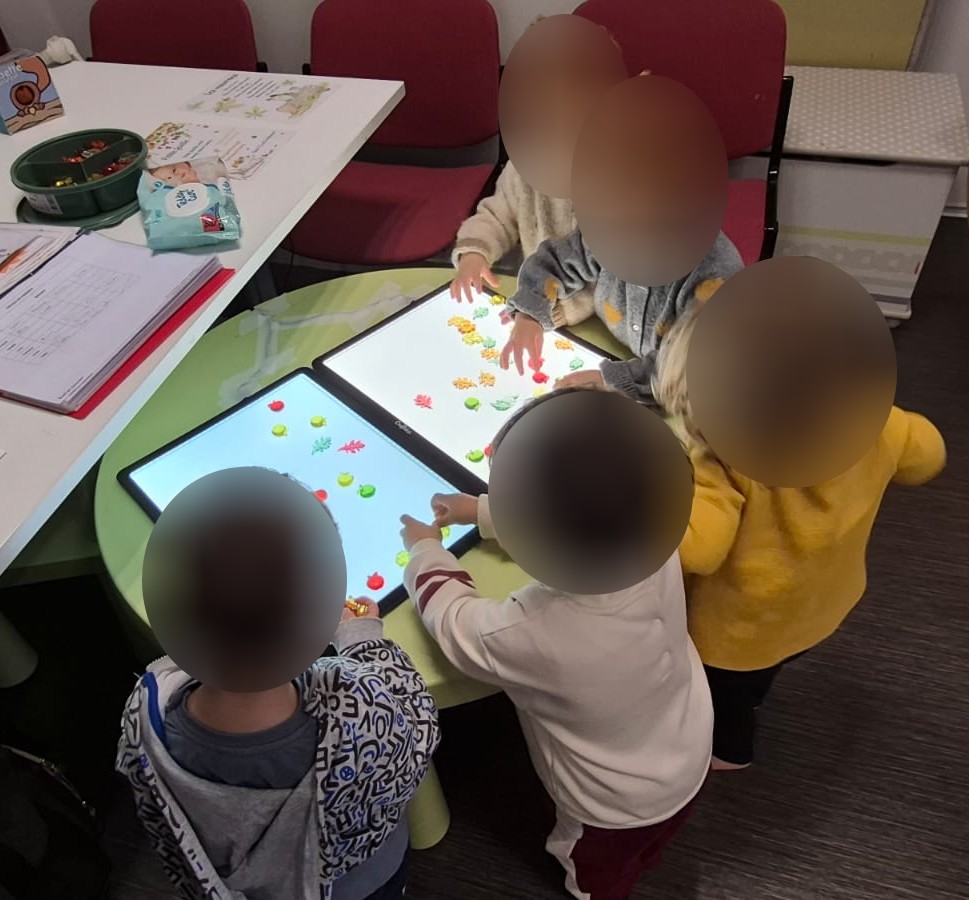 Les enfants ont commencé par découvrir l’automne sous un nouvel angle grâce à la tablette lumineuse. Feuilles colorées, glands, petites citrouilles… Tous ces trésors se révélaient différemment lorsqu’ils étaient éclairés.