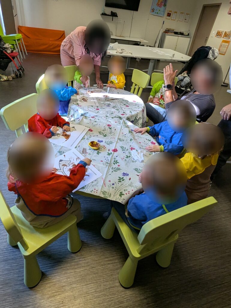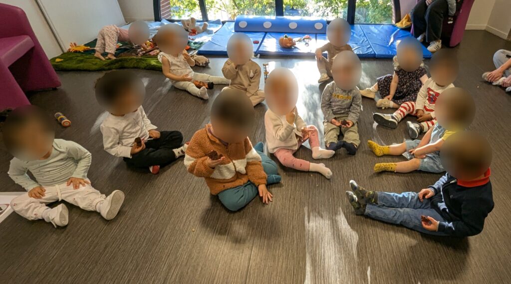La matinée a débuté par un temps d’accueil chaleureux, un rituel essentiel qui aide les enfants à se repérer, à s’ancrer dans le groupe et à développer leur sentiment de sécurité. Se dire bonjour, se regarder, chanter ensemble : ces instants renforcent la confiance et le lien social tout en favorisant le langage et la communication.