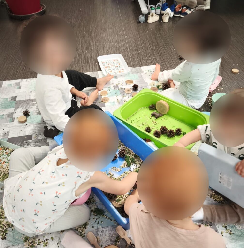 Comme lors de la première séance, le bac sensoriel de la forêt a permis aux enfants d’explorer librement différents éléments naturels : pommes de pin, morceaux de bois, feuilles, mousse… Toucher, sentir, manipuler : toutes ces expériences sensorielles développent la curiosité, la concentration et le langage descriptif.