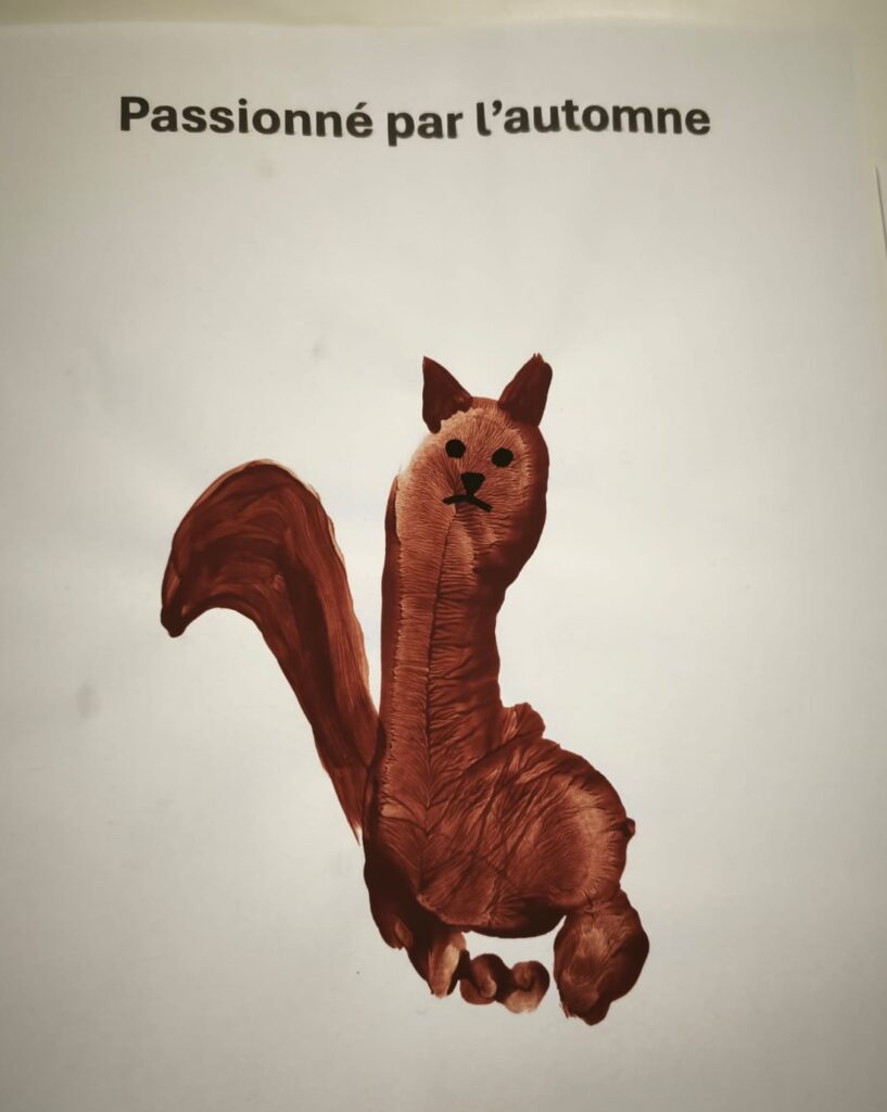 Les enfants ont réalisé une empreinte de leur pied, transformée en adorable écureuil ! Cette activité ludique et sensorielle leur permet d’explorer leur schéma corporel, de développer la motricité fine et la coordination œil-main tout en laissant une belle trace artistique qu’ils sont fiers de montrer.
