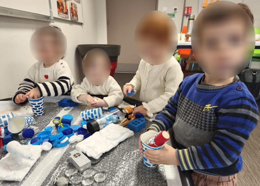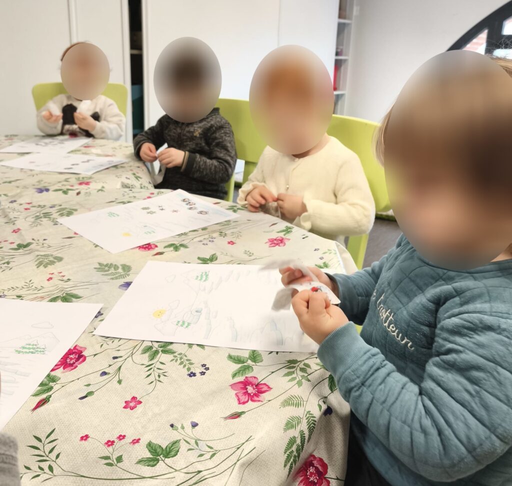 Nous avons ensuite proposé une activité gommettes spécial banquise. Positionner, coller, ajuster… un exercice tout simple en apparence, mais qui sollicite la motricité fine, la concentration et le repérage dans l’espace. Les paysages polaires ont peu à peu pris vie sous les petites mains appliquées.