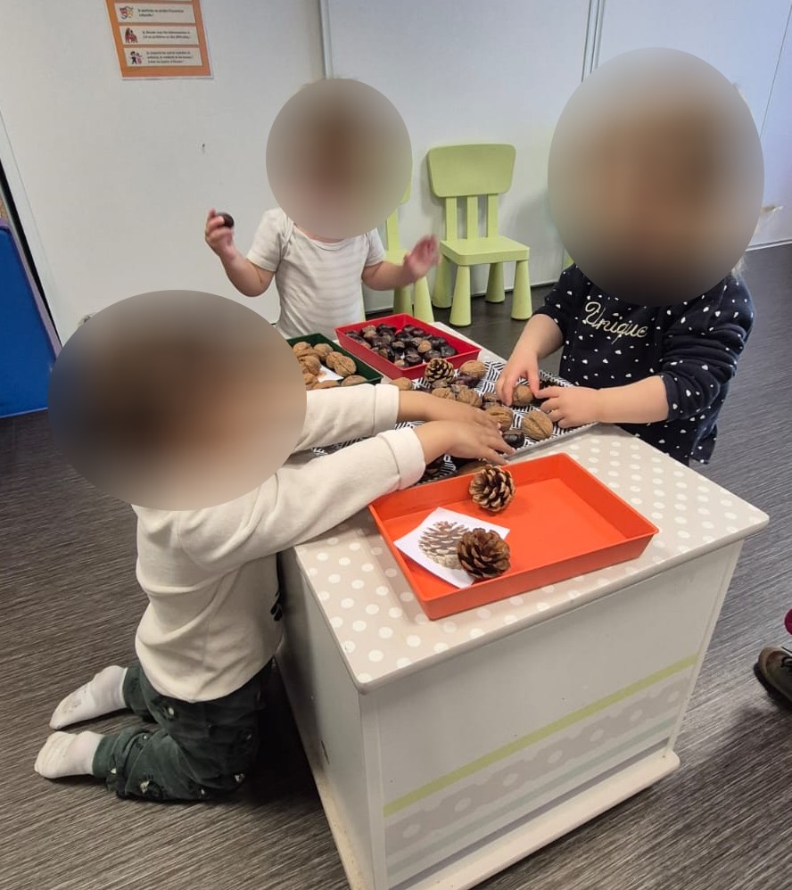 Un moment de calme et d’observation avec le tri des éléments de la végétation : marrons, noix et pommes de pin. Les enfants ont manipulé, comparé, senti et classé ces trésors naturels, les regroupant selon leur texture, leur forme ou leur taille.
