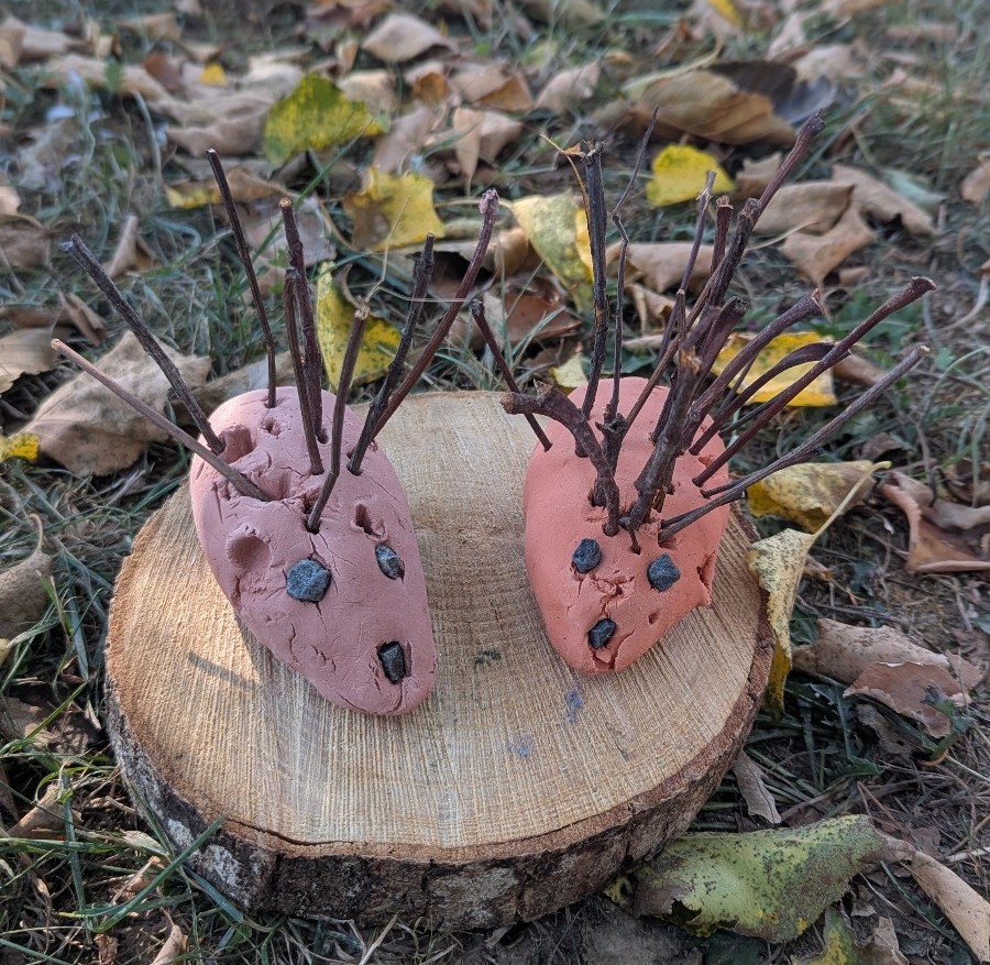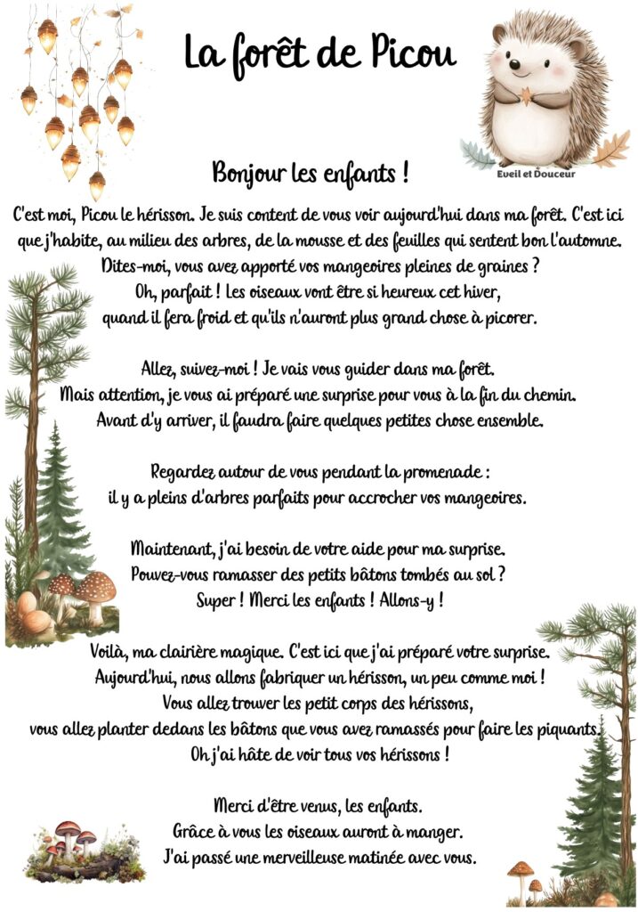 Au bout du sentier, nous sommes arrivés dans la clairière magique de Picou. Là, une belle surprise les attendait : un atelier créatif ! Les enfants ont planté les bâtons sur des petits corps de hérisson pour former les piquants. Ce moment de création leur a permis de manipuler, d’expérimenter et de développer leur précision tout en favorisant la concentration et la fierté de “faire tout seul”.
