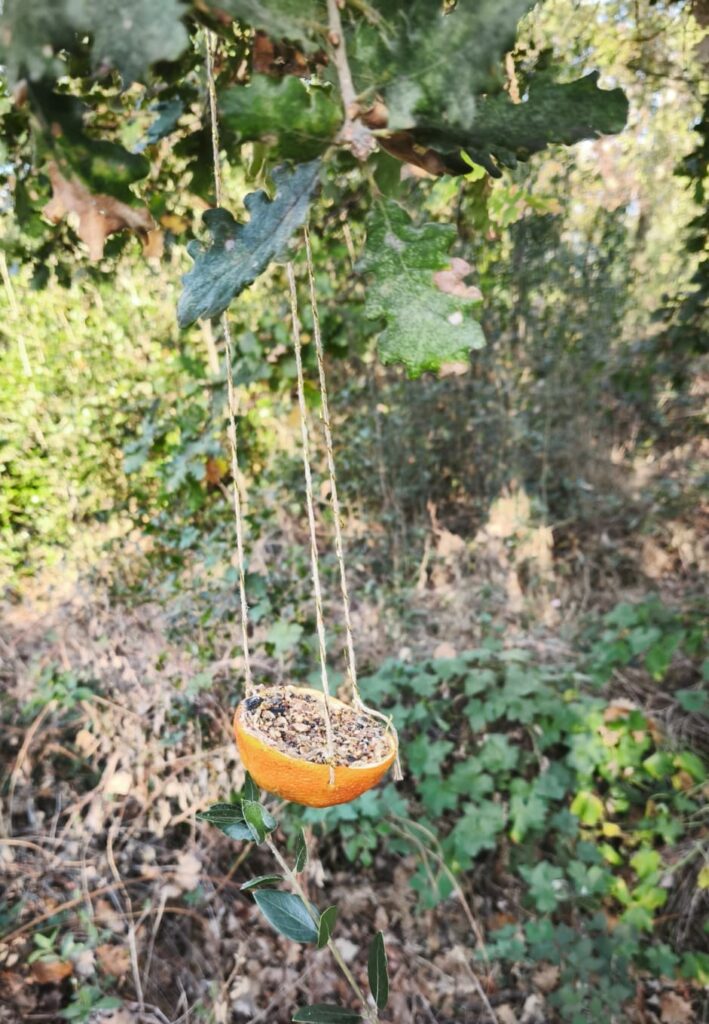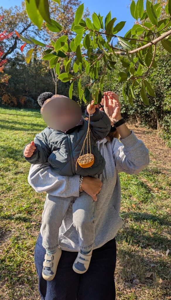 Guidés par Picou, nous avons suivi le sentier forestier. En marchant, les enfants ont pu déposer leurs mangeoires orange remplies de graines pour les oiseaux sauvages. Ce geste simple nourrit leur sens de la bienveillance envers la nature et leur apprend à observer le monde vivant qui les entoure.