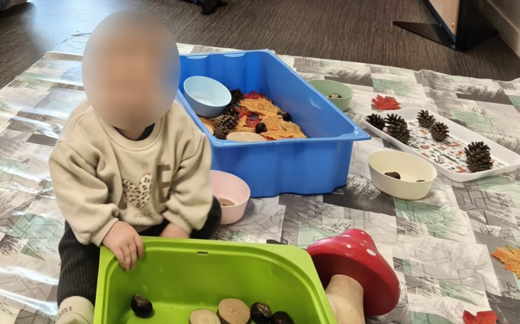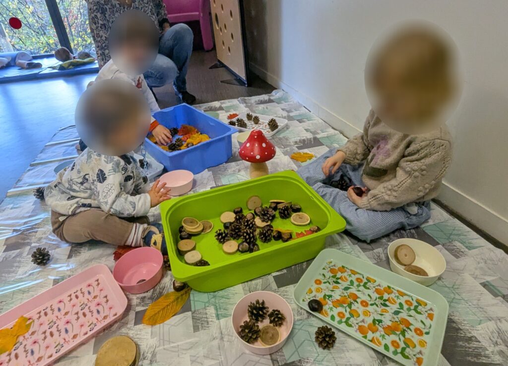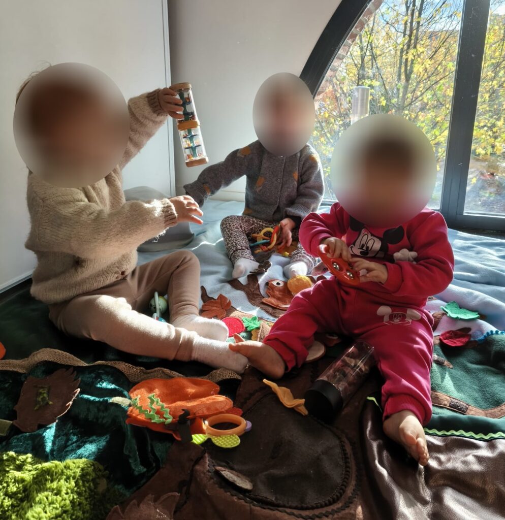 Le bac sensoriel débordait de pommes de pin, marrons, bois et feuilles d’automne. Les enfants les ont touchés, triés, transvasés, et nous avons fait pleuvoir une cascade de feuilles. En manipulant toutes ces textures naturelles, ils affinaient leurs gestes sans même s’en rendre compte. Une véritable exploration libre, qui les invite à observer, comparer et expérimenter.