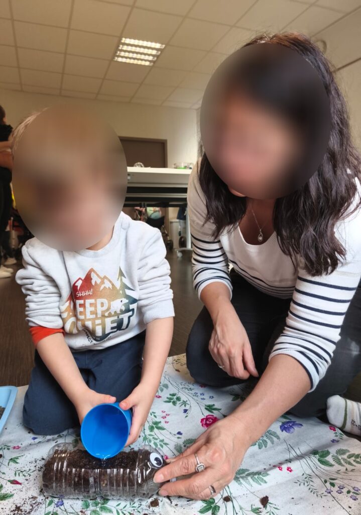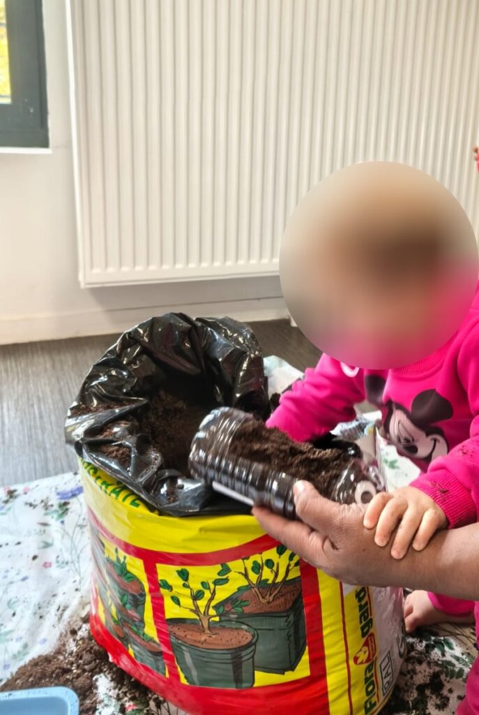Puis une surprise les attendait : un sac de terre et des graines vertes, des lentilles comme celles de Roupi ! Les enfants ont rempli leur récipient, ajouté les graines, recouvert doucement de terre puis arrosé avec application. Planter une graine, c’est comprendre qu’il faut du temps pour voir grandir quelque chose… et les enfants aiment observer, jour après jour, les petits changements qui apparaissent.