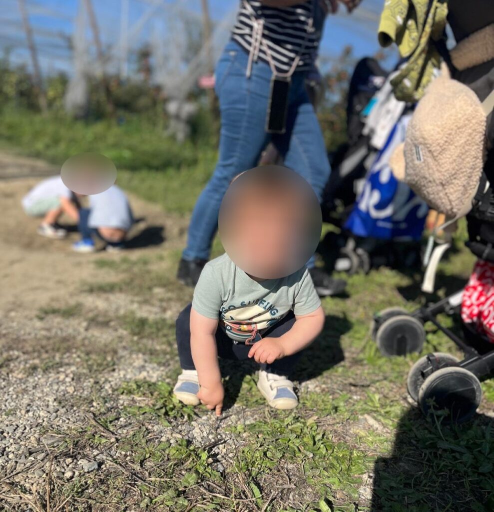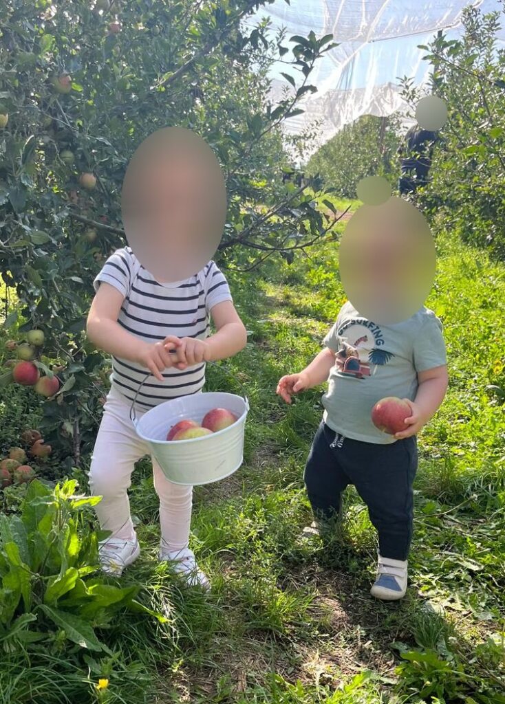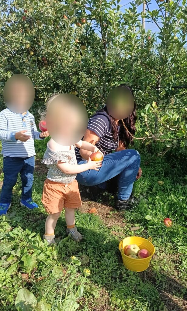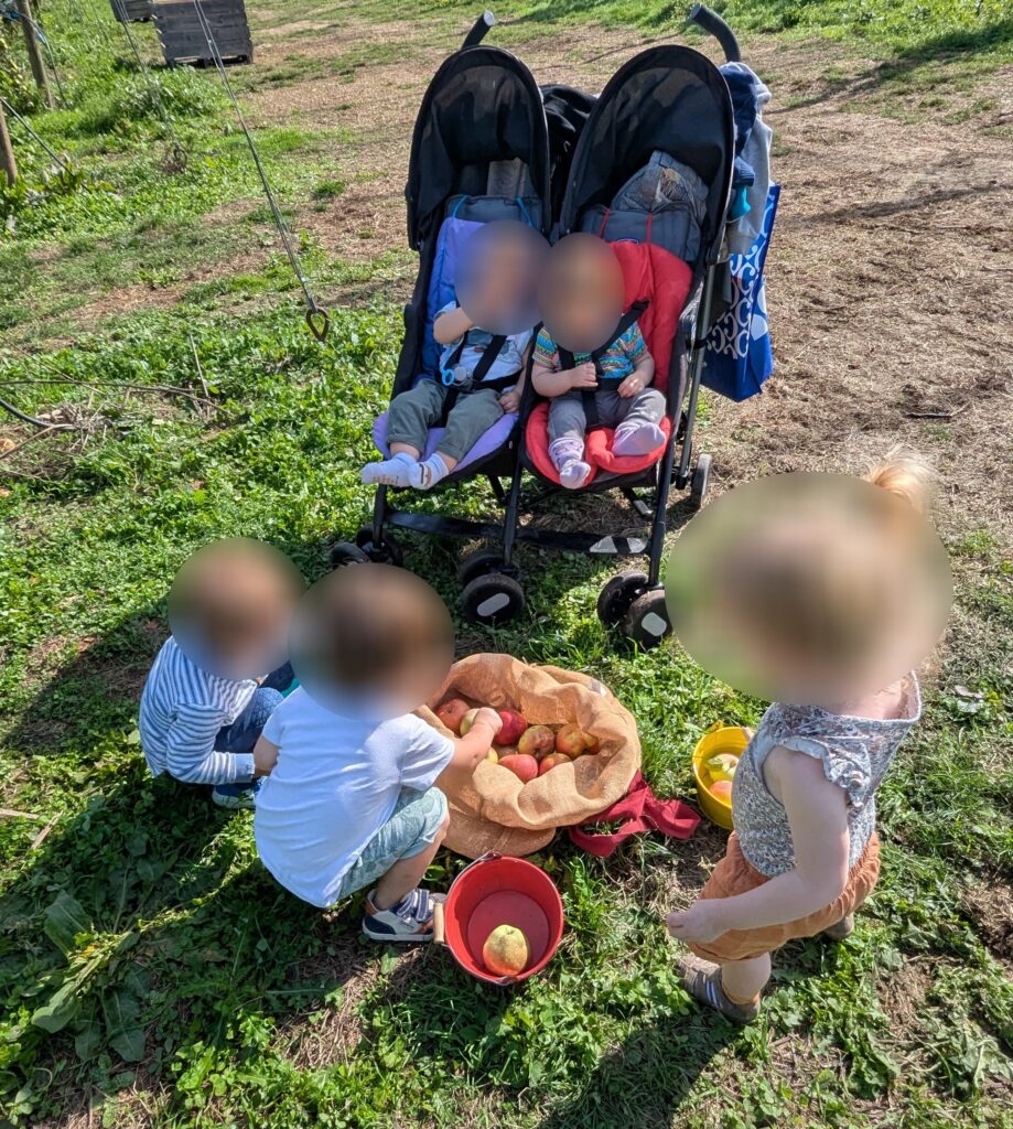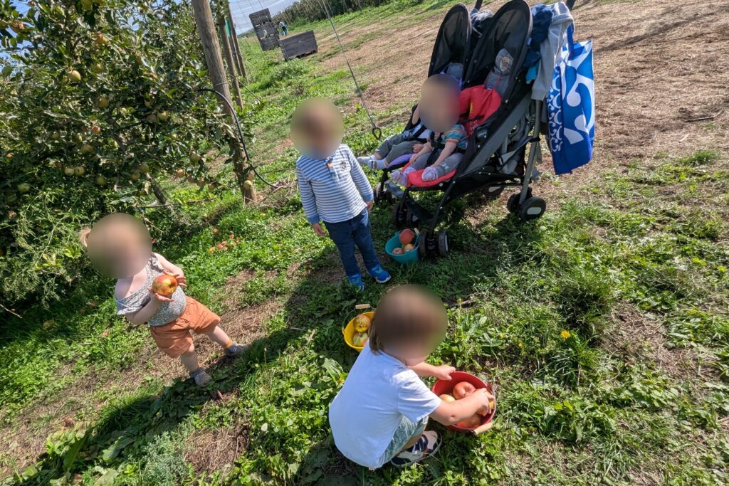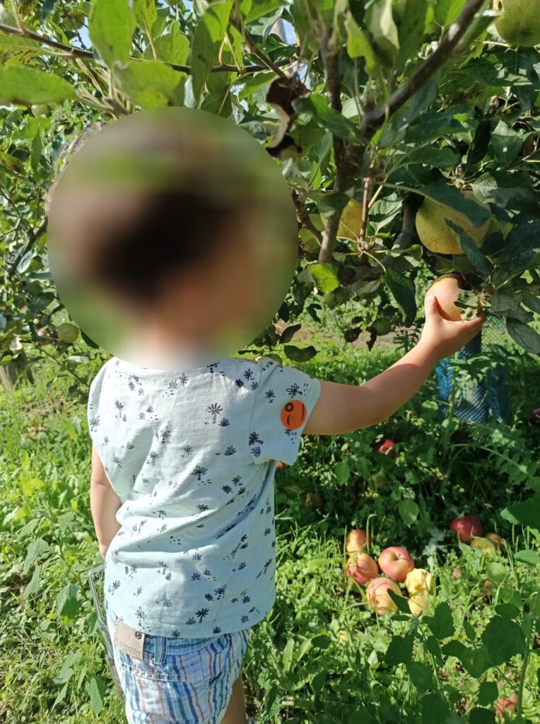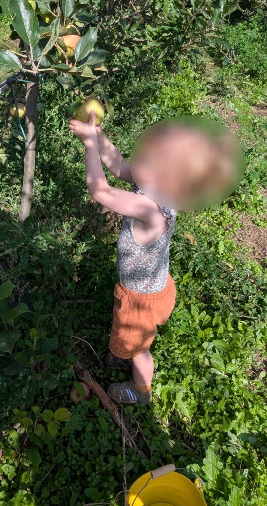 Maintenant il faut arpenter le verger pour aller à la cueillette. Excellent pour la découverte du monde naturel, et la stimulation sensorielle.
