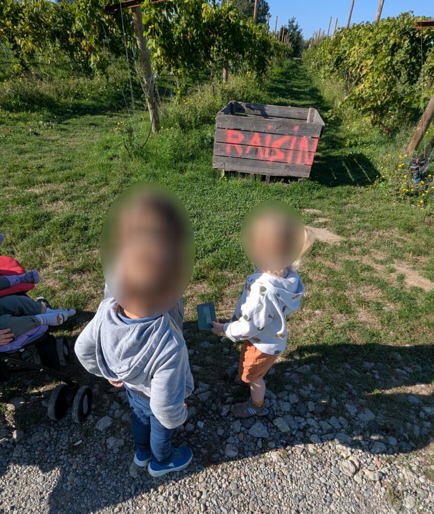 Carte et photo en main, on arpente le chemin. Quelques petites pause en chemin, c’est trop chouette de gratter les cailloux. Et d’ailleurs, tous ces cailloux et l’herbe, rien de mieux pour le développement de la motricité globale et l’équilibre.