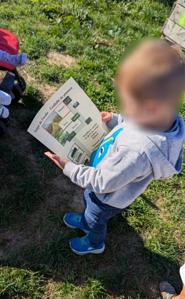 Pomme Pom a laissé une carte pour nous guider jusqu’au verger. Elle a fait des petites cartes photo qui ont été distribuées aux enfants. Ils devaient sur le chemin du verger, retrouver l’endroit de la carte. Nous sommes partis de la halle. Ils ont réussi, ils sont forts ces loulous. Pomme Pom nous explique aussi comment cueillir les pommes sans abîmer les pommiers.