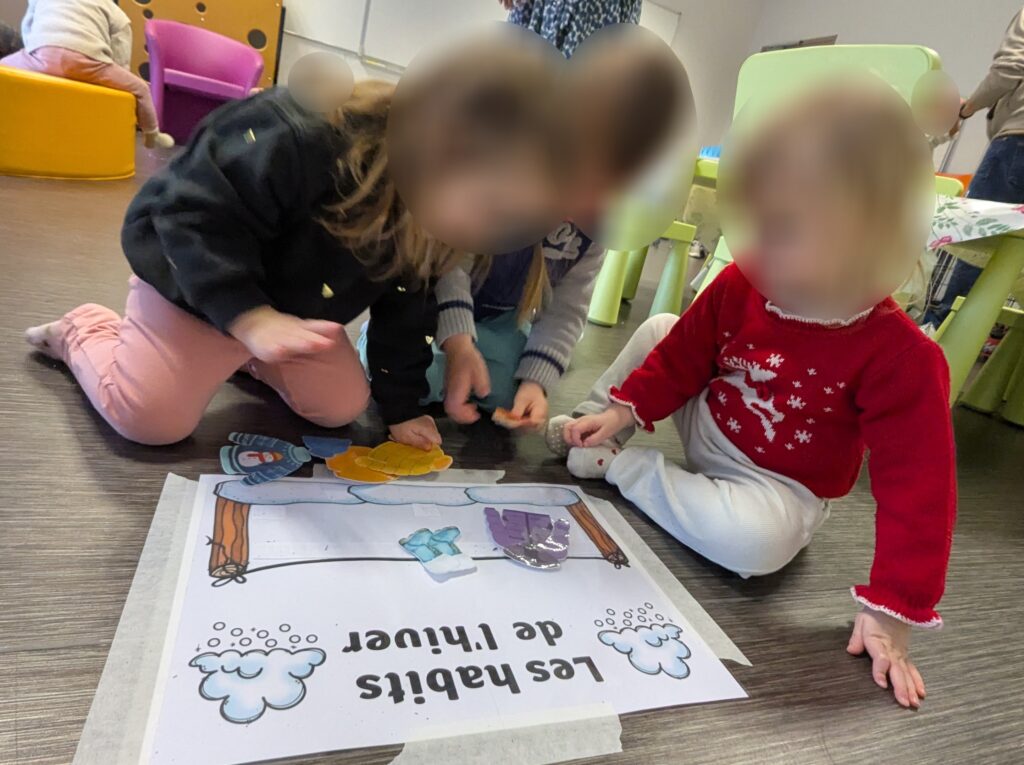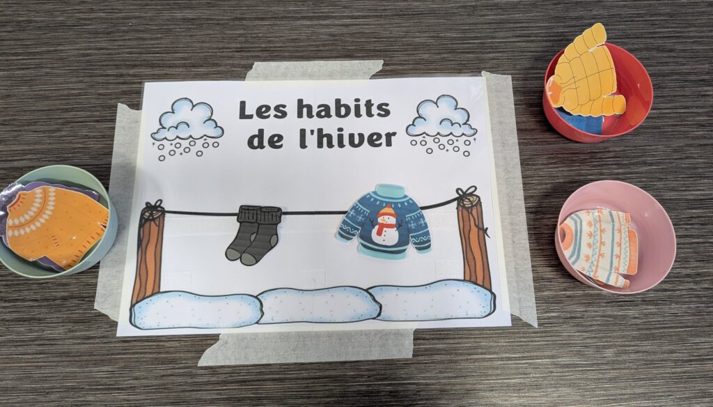 Un atelier ludique a été proposé autour des habits de l’hiver : pulls, manteaux, chaussettes, bottes… Les enfants devaient étendre les vêtements au bon endroit.