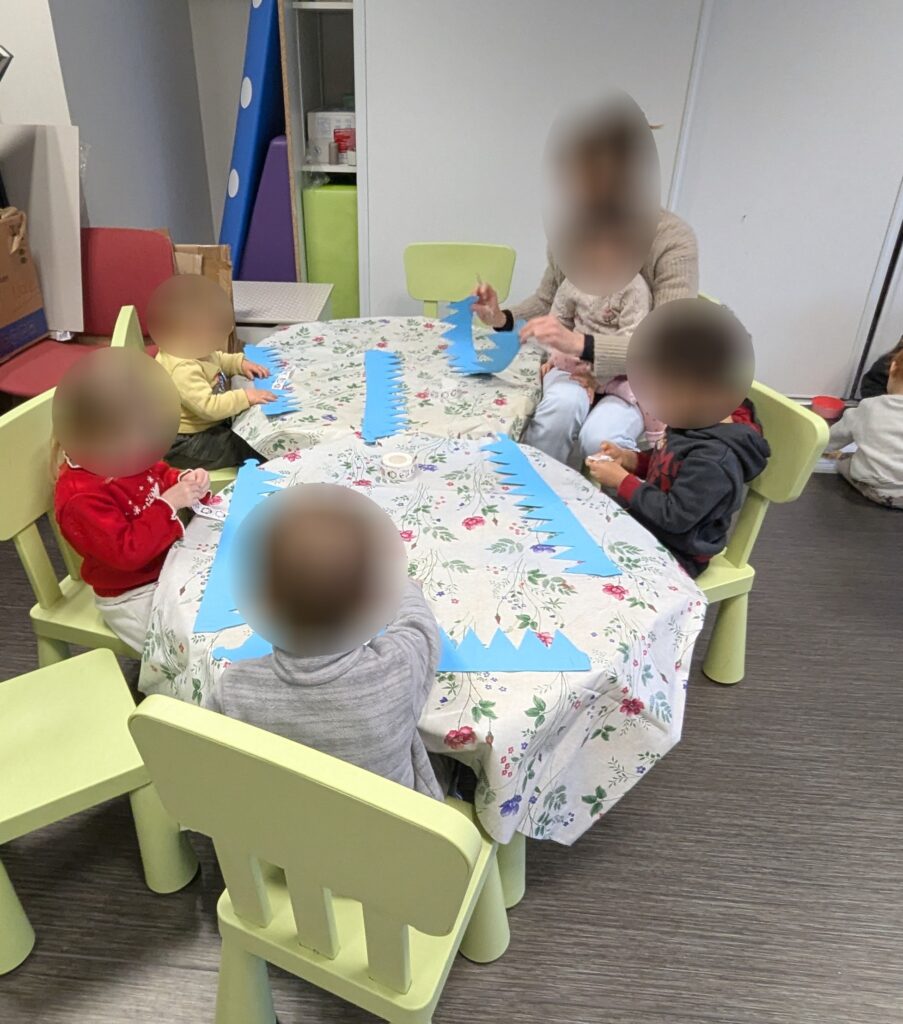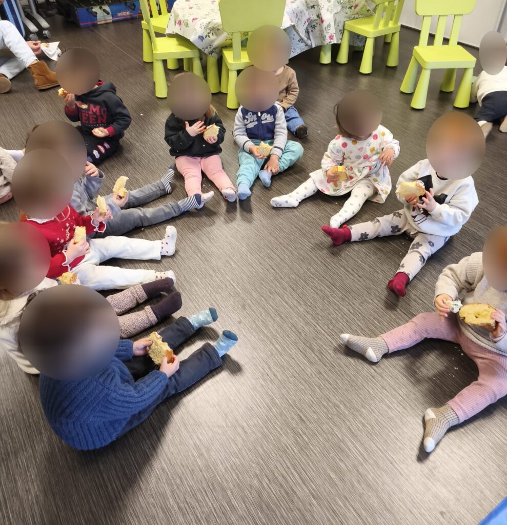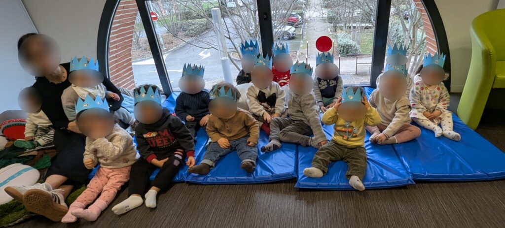 Pour terminer, les enfants, fiers de leurs belles couronnes, se sont installés pour un temps calme autour d’histoires et de chansons. Ces moments apaisants soutiennent le développement du langage, l’écoute et la sécurité affective, tout en offrant une transition douce avant le départ.