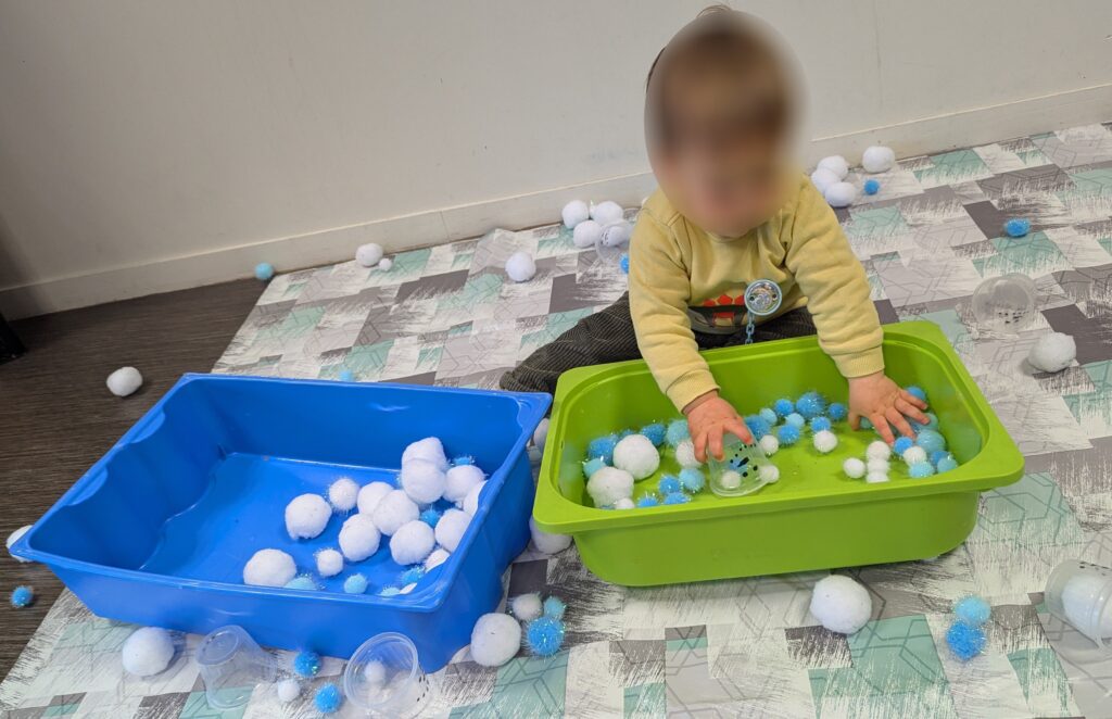 Tout au long de la matinée, le bac sensoriel d’hiver est resté à disposition. Les enfants ont pu manipuler librement les différents éléments, explorer les textures et expérimenter à leur rythme. Ce type de jeu favorise la concentration, l’éveil des sens et le plaisir de la découverte autonome.