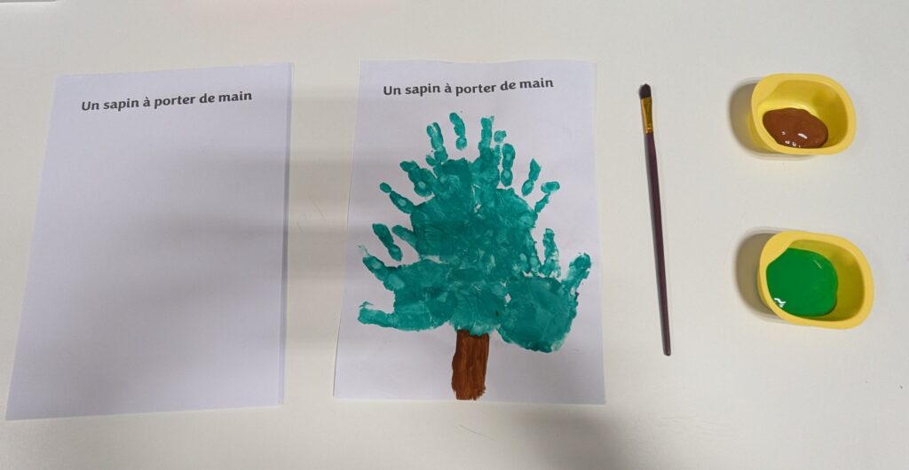 Les enfants ont ensuite réalisé des empreintes de mains, transformées en sapins. Cette activité permet de prendre conscience de son corps, de laisser une trace et de développer la créativité. Elle soutient également la motricité fine et procure un moment de calme et de concentration.